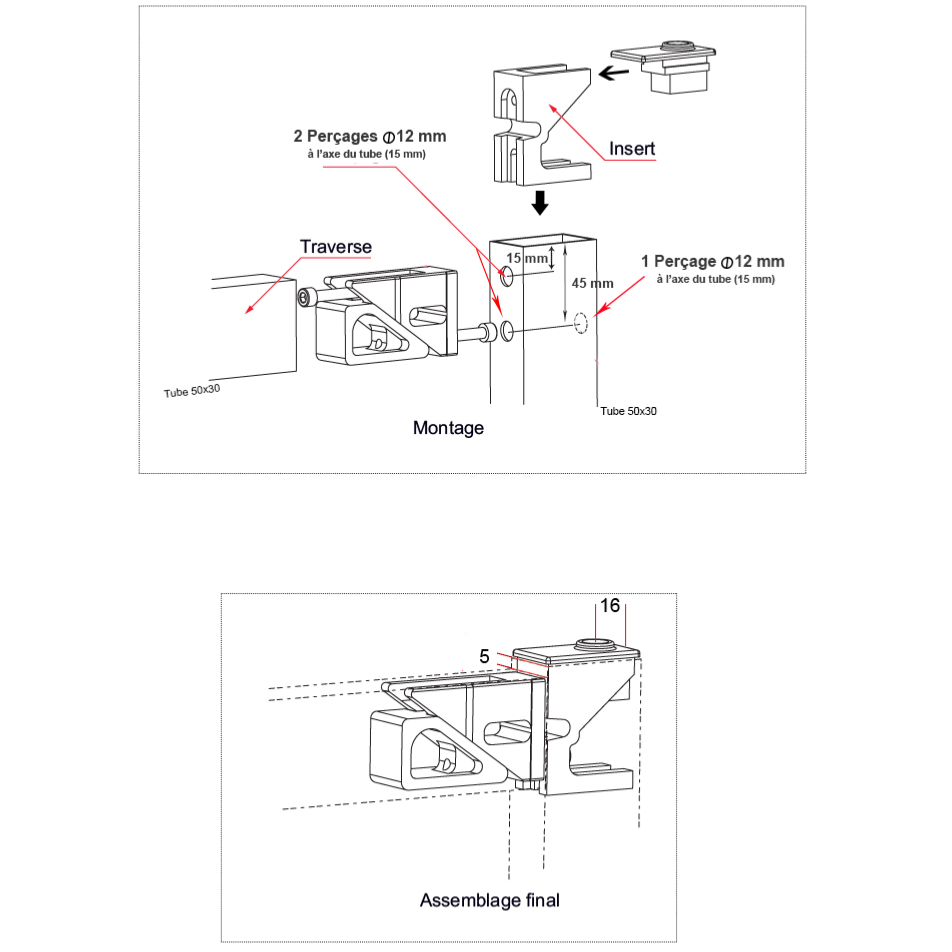 - 2 embouts percés diamètre 12 mm pour les gonds